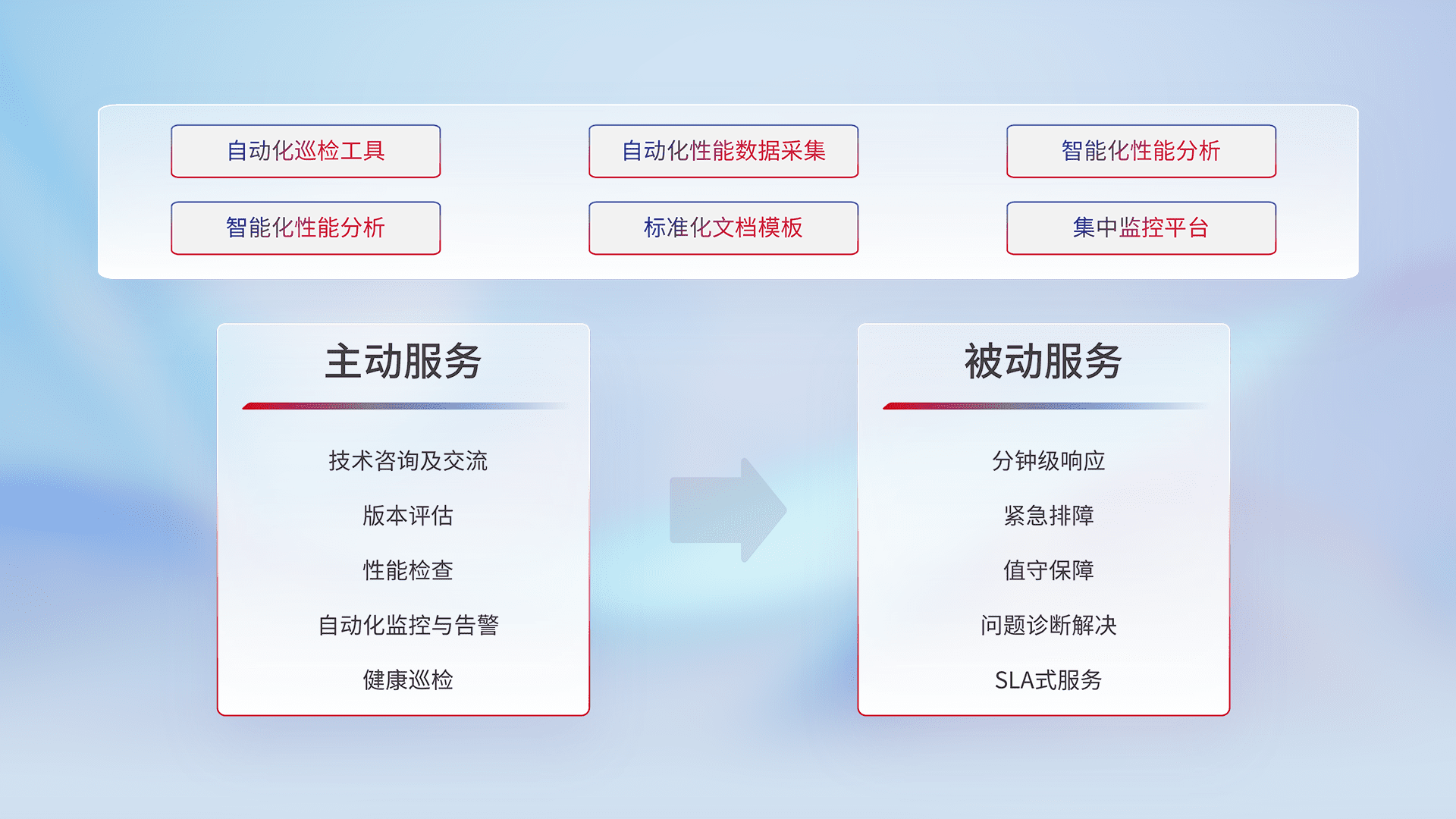 智能化工具和标准化文档,,,,保障服务质量,,,提供主动服务(包含技术咨询、、、版本评估、、性能检查、、、、自动化监控与告警、、健康巡检)和被动服务包含(分钟级响应、、、、紧急排障、、值守保障、、、、问题诊断解决、、、SLA服务)。。。。